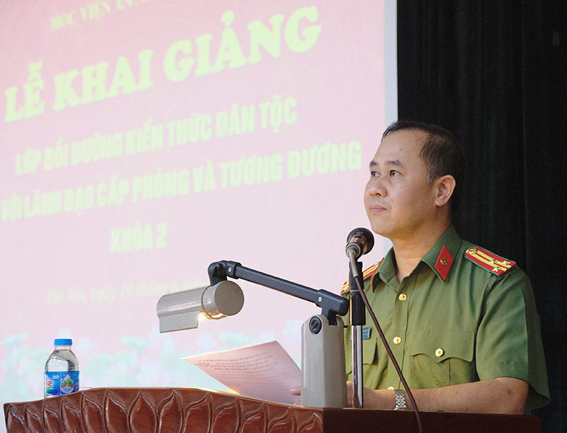 Trong diễn văn Khai giảng, Thiếu tướng, TS Trần Kim Hải - Phó Giám đốc Học viện ANND nhấn mạnh, vấn đề dân tộc là một trong những nội dung quan trọng của cách mạng xã hội chủ nghĩa. Trong thời đại nào, đối với bất kỳ quốc gia nào, dân tộc luôn là vấn đề mang tính thời sự quan trọng. Hiện nay, Việt Nam là một quốc gia đa dân tộc, do đó vấn đề dân tộc tiếp tục là một trong những vấn đề trọng tâm mà các thế lực thù địch lợi dụng triển khai các hoạt động chống phá nhằm chia rẽ khối đại đoàn kết dân tộc. Vì vậy, Đảng, Nhà nước luôn coi trọng việc xây dựng và triển khai thực hiện chủ trương, chính sách dân tộc là nhiệm vụ hàng đầu. Ngày 26/6/2018, Thủ tướng Chính phủ đã ban hành Quyết định số 771/QĐ-TTg về việc phê duyệt Đề án “Bồi dưỡng kiến thức dân tộc cho cán bộ, công chức, viên chức giai đoạn 2018 - 2025”. Trong đó, xác định rõ mục tiêu cập nhật, trang bị kiến thức về dân tộc, văn hoá thiểu số, chính sách dân tộc, góp phần nâng cao nhật thức, năng lực cho đội ngũ cán bộ công chức, viên chức cấp phòng để thực hiện tốt chủ trương, đường lối của Đảng, chính sách, pháp luật của Nhà nước về công tác dân tộc.