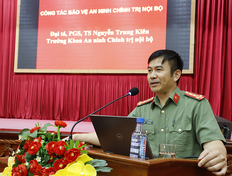 Đại tá, PGS.TS Nguyễn Trung Kiên - Trưởng khoa An ninh chính trị nội bộ giảng dạy chuyên đề tại lớp bồi dưỡng.
