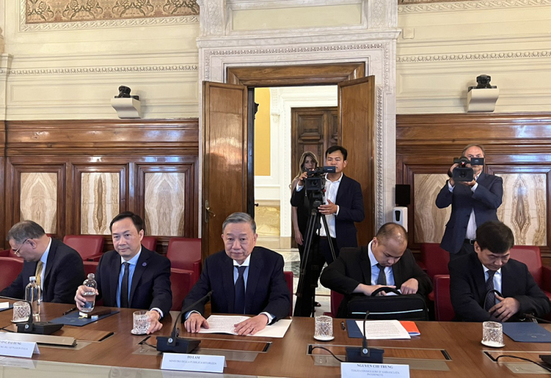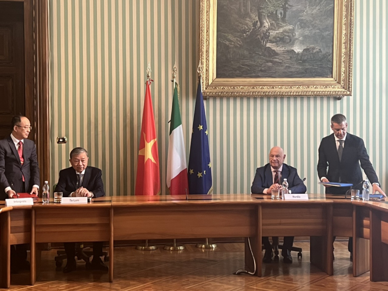 Nhận lời mời của ngài Matteo Piantedosi, Bộ trưởng Bộ Nội vụ Italy, Đoàn đại biểu cấp cao Bộ Công an do Đại tướng Tô Lâm, Uỷ viên Bộ Chính trị, Bộ trưởng làm Trưởng đoàn đã sang thăm, làm việc tại Cộng hòa Italy từ ngày 17-19/7.