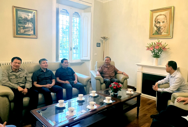 * Trong khuôn khổ chuyến thăm, làm việc tại Cộng hoà Italy, Bộ trưởng Tô Lâm và Đoàn công tác đã đến thăm Đại sứ quán Việt Nam tại Cộng hoà Italy. Bộ trưởng Tô Lâm đã thông báo vắn tắt về tình hình kinh tế, chính trị, xã hội trong nước, kết quả công tác nổi bật về bảo đảm an ninh, trật tự của lực lượng CAND thời gian qua.