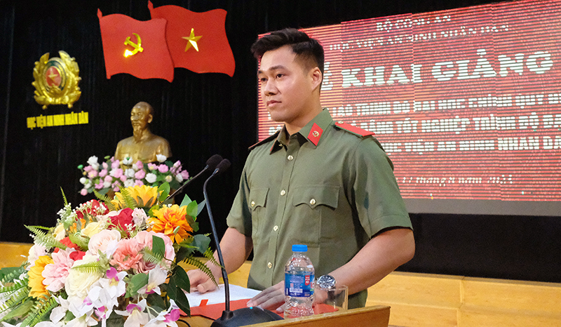 Phát biểu cảm tưởng tại buổi Lễ, học viên Vũ Thái Bình Dương - đại diện học viên Khóa học gửi lời cảm ơn sâu sắc đến lãnh đạo Bộ Công an, Đảng ủy, Ban Giám đốc Học viện, các đơn vị chức năng của Học viện, các thầy giáo, cô giáo đã quan tâm, tạo mọi điều kiện cho học viên ngay từ những ngày đầu nhập học; đồng thời xin hứa không ngừng phấn đấu, cố gắng học tập, rèn luyện vượt qua mọi khó khăn, thử thách để đạt được kết quả học tập cao nhất.