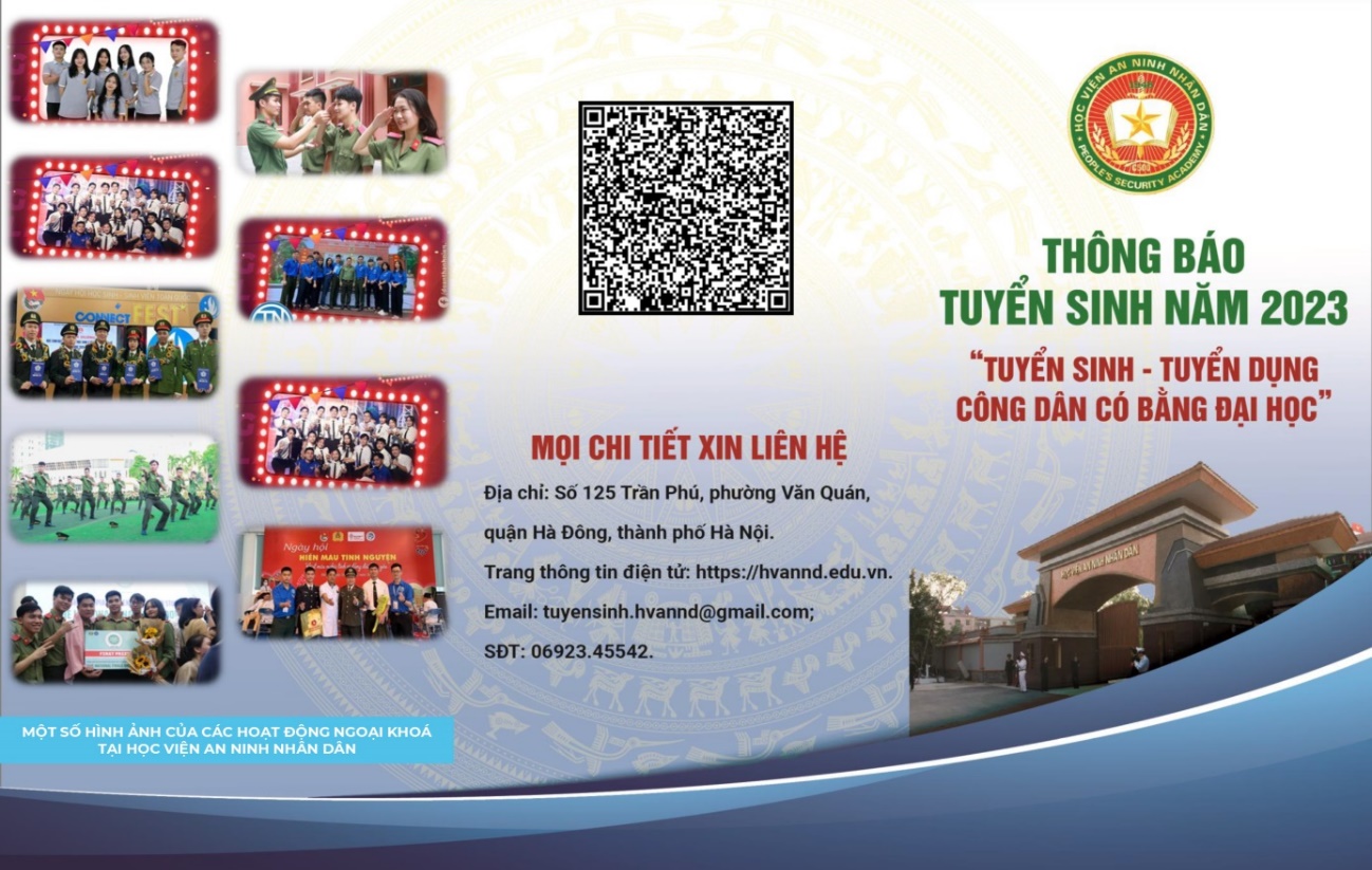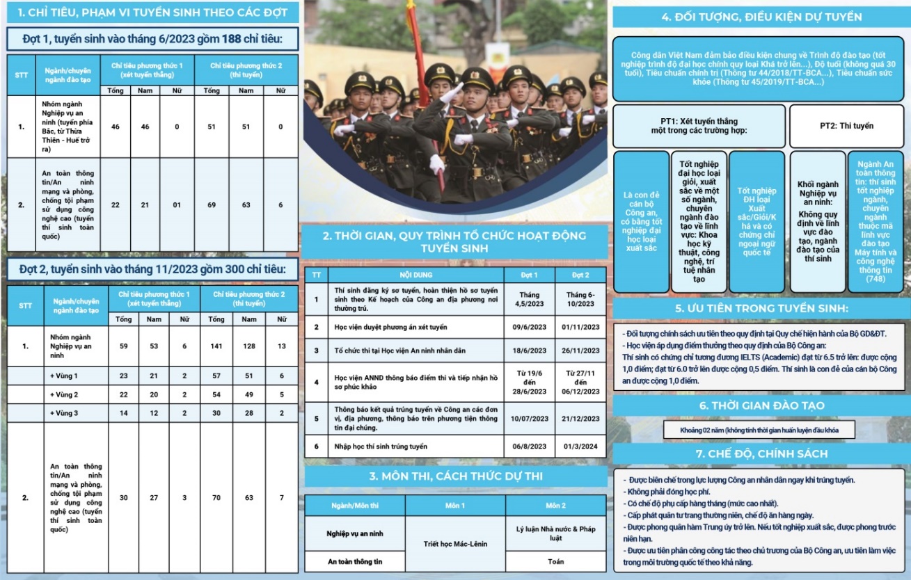 Kỳ thi tuyển sinh kết hợp tuyển dụng năm 2023 dành cho công dân có bằng tốt nghiệp đại học trở lên sắp tới được tổ chức tại Học viện ANND vào tháng 11/2023 với 300 chỉ tiêu, gồm 02 nhóm ngành đào tạo là Nghiệp vụ an ninh và An toàn thông tin (an ninh mạng và phòng, chống tội phạm sử dụng công nghệ cao).