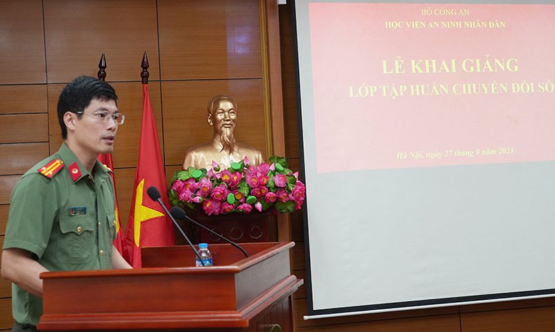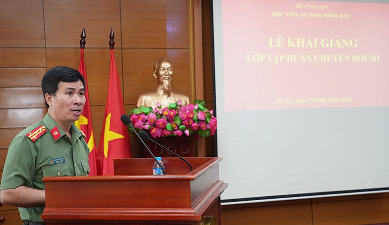 Phát biểu tại Lễ Khai giảng, Đại tá, GS.TS Nguyễn Trường Thọ - Phó Giám đốc Học viện ANND nhấn mạnh, ngày 12/9/2022, Giám đốc Học viện ANND đã ký Quyết định số 5558/QĐ-T01-VP về phê duyệt Đề án Chuyển đổi số và xây dựng hệ sinh thái đổi mới sáng tạo tại Học viện đến năm 2030, trong đó xác định phát triển nguồn nhân lực phục vụ công tác chuyển đổi số là một trong mười giải pháp trọng tâm. Do đó, mục đích của Lớp Bồi dưỡng nhằm nâng cao năng lực, kiến thức, kỹ năng cho đội ngũ cán bộ, giảng viên về chuyển đổi số, góp phần nâng cao chất lượng nguồn nhân lực để triển khai có hiệu quả các nhiệm vụ chuyển đổi số tại Học viện.