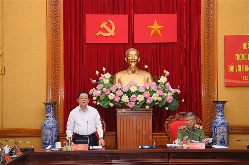 Dự buổi làm việc có các đồng chí: Đại tướng Tô Lâm, Ủy viên Bộ Chính trị, Bí thư Đảng ủy Công an Trung ương, Bộ trưởng Bộ Công an; Phan Xuân Thủy, Phó trưởng Ban Tuyên giáo Trung ương, Phó trưởng Đoàn kiểm tra; các đồng chí trong Ban Thường vụ Đảng ủy CATW, lãnh đạo Bộ Công an…