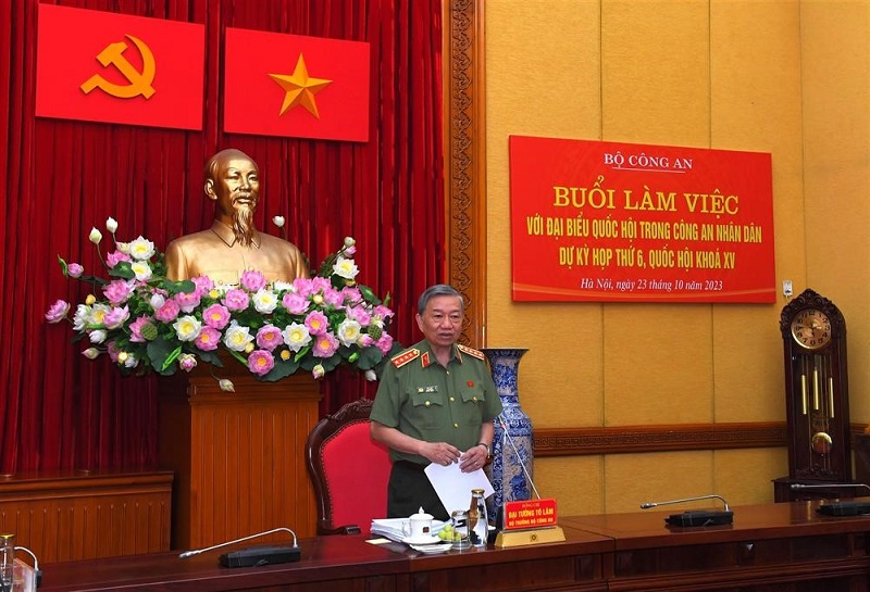 Chiều 23/10/2023, tại Hà Nội, Đại tướng Tô Lâm, Ủy viên Bộ Chính trị, Bộ trưởng Bộ Công an chủ trì buổi làm việc với các đại biểu Quốc hội trong Công an nhân dân (CAND) dự Kỳ họp thứ 6, Quốc hội khóa XV.