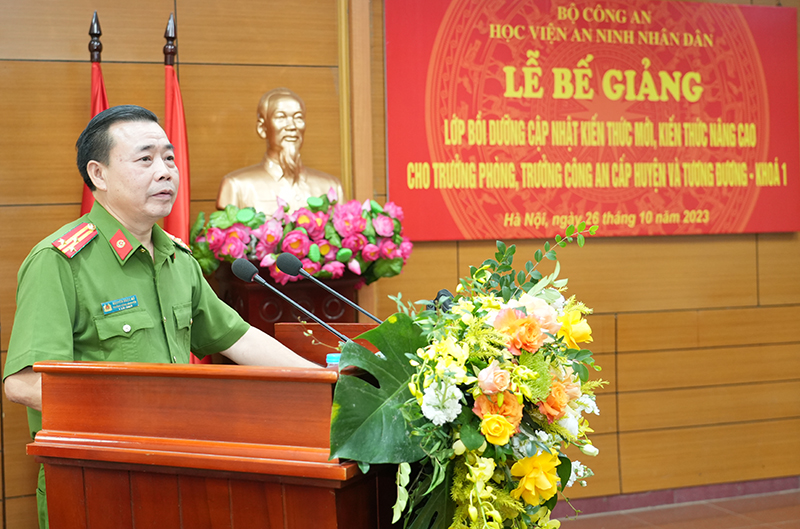 Phát biểu chỉ đạo tại Lễ Bế giảng, Thiếu tướng, TS Trần Kim Hải - Phó Giám đốc Học viện chúc mừng và đánh giá cao kết quả học tập của các học viên; đồng thời chỉ rõ, trong thời gian tới, nhiệm vụ đảm bảo an ninh quốc gia và giữ gìn trật tự an toàn xã hội đang đứng trước những diễn biến phức tạp, khó dự báo, đặt ra nhiều khó khăn, phức tạp mới cho lực lượng Công an. Do đó, đòi hỏi mỗi cán bộ, chiến sĩ Công an, trong đó có các đồng chí lãnh đạo cấp Trưởng phòng, Trưởng Công an huyện và tương đương phải luôn học tập nâng cao trình độ, nắm chắc tình hình, quán triệt chủ trương, đường lối của Đảng, Nhà nước, Bộ Công an để trực tiếp chỉ đạo có hiệu quả công tác xây dựng lực lượng ở đơn vị, địa phương đang công tác, góp phần thực hiện có hiệu quả Nghị quyết số 12 ngày 16/3/2022 của Bộ Chính trị về xây dựng lực lượng CAND thực sự trong sạch, vững mạnh, chính quy, tinh nhuệ, hiện đại, đáp ứng yêu cầu, nhiệm vụ trong tình hình mới.