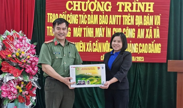 Chia sẻ khó khăn với địa phương và đồng bào, Đoàn công tác đã trao tặng 01 bộ máy tính cho Công an xã Cần Nông; 01 bộ máy in cho Đoàn Thanh niên xã Cần Nông; 01 bộ máy in, 400 bộ áo ấm, 400 đôi dép, 400 ô che mưa, đồ dùng học tập, sữa và một số nhu yếu phẩm cho 397 học sinh Trường Tiểu học và Trung học cơ sở xã Cần Nông.