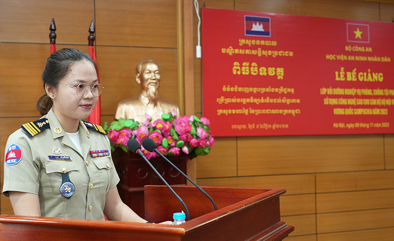 Phát biểu cảm tưởng tại buổi Lễ, đại diện cho học viên lớp bồi dưỡng trân trọng gửi lời cảm ơn sâu sắc đến lãnh đạo Bộ Công an Việt Nam, Đảng ủy, Ban Giám đốc Học viện và các đơn vị chức năng đã quan tâm, tạo mọi điều kiện để học viên được học tập, giao lưu, học hỏi kinh nghiệm với Công an các đơn vị, địa phương Việt Nam, để lại những tình cảm tốt đẹp và ấn tượng sâu sắc về tình hữu nghị giữa Bộ Nội vụ Vương quốc Campuchia và Bộ Công an Việt Nam. Đồng thời xin hứa, sau khi trở về nước sẽ nêu cao tinh thần trách nhiệm, tích cực học hỏi, trau dồi kiến thức, vận dụng linh hoạt, sáng tạo những kiến thức đã được truyền thụ vào thực tiễn công tác.