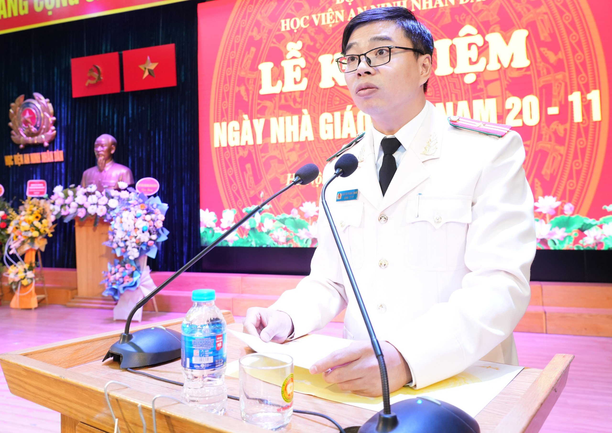 Thiếu tá, TS Nguyễn Trung Thành - Giảng viên Khoa An ninh kinh tế, đại diện cho đội ngũ giảng viên và cán bộ quản lý giáo dục đang công tác tại Học viện trân trọng gửi lời tri ân sâu sắc tới các nhà giáo lão thành, các thầy, cô giáo, đội ngũ cán bộ quản lý giáo dục của Học viện; đồng thời xin hứa, cán bộ, giảng viên Học viện nguyện đem hết tâm lực, trí lực tiếp tục nỗ lực phấn đấu học tập bồi dưỡng, nâng cao năng lực chuyên môn, nghiên cứu khoa học, xây dựng lý luận nghiệp vụ CAND để phục vụ cho sự nghiệp cách mạng của Đảng, Nhà nước, Bộ Công an, góp phần hoàn thành xuất sắc sứ mệnh cao cả của người giáo viên Công an nhân dân trong sự nghiệp xây dựng và phát triển Học viện trở thành cơ sở giáo dục trọng điểm, trung tâm nghiên cứu khoa học uy tín của ngành Công an.