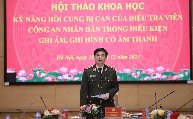 Ngày 15/12/2023, Học viện An ninh nhân dân (ANND) tổ chức Hội thảo khoa học với chủ đề “Kỹ năng hỏi cung bị can của Điều tra viên Công an nhân dân trong điều kiện ghi âm, ghi hình có âm thanh”. Thiếu tướng, PGS.TS Trịnh Ngọc Quyên - Bí thư Đảng ủy, Giám đốc Học viện ANND chủ trì Hội thảo.