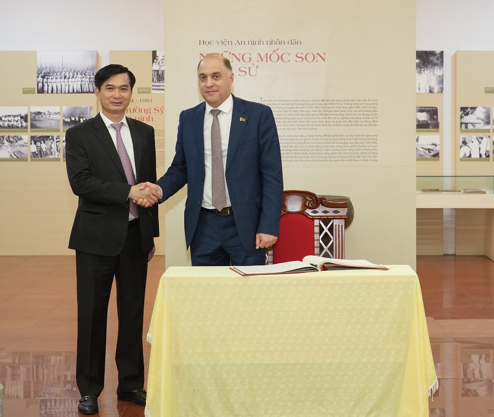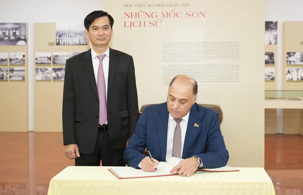 Đáp lại sự đón tiếp nồng nhiệt của đồng chí Giám đốc Học viện và Đoàn Học viện ANND, đồng chí Volfovich Aleksandr Grigorievich - Thư ký Hội đồng An ninh Quốc gia Cộng hòa Belarus thay mặt Đoàn công tác của Belarus đã bày tỏ lòng cảm ơn chân thành với sự tiếp đón nhiệt tình, chu đáo của Lãnh đạo Học viện và viết lưu bút nói lên những tình cảm tốt đẹp cảm ơn sự tiếp đón nồng hậu của Học viện và những lời chúc tốt đẹp nhất về sự phát triển bền vững của Học viện trong thời gian tới.