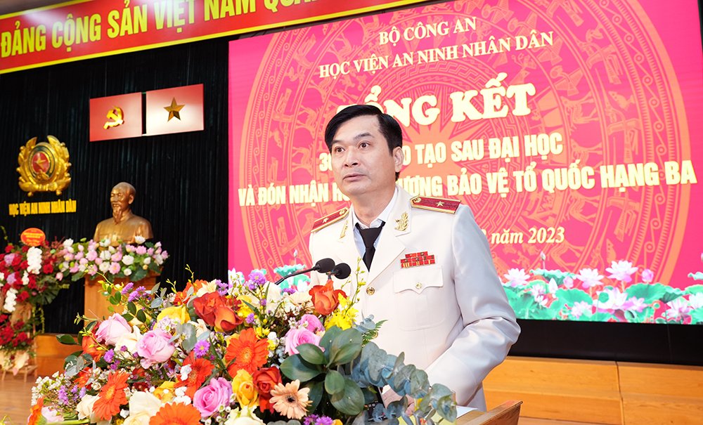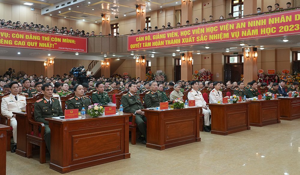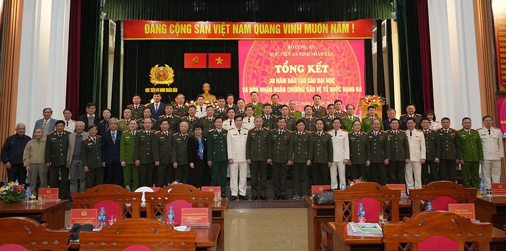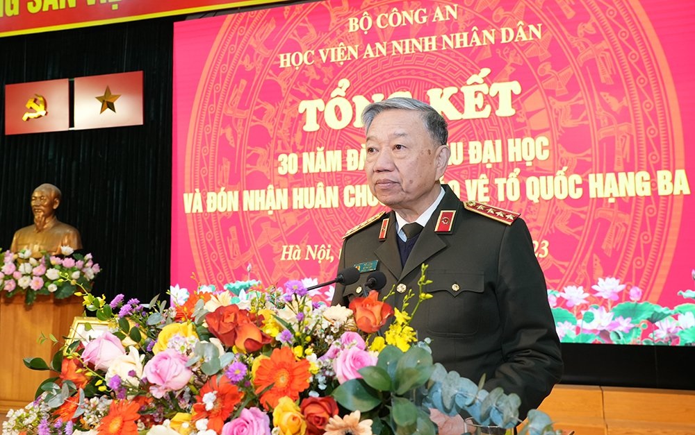 Ngày 22/12/2023, Học viện An ninh nhân dân (ANND) long trọng tổ chức Lễ tổng kết 30 năm đào tạo hệ sau đại học (1993 - 2023) và đón nhận Huân chương Bảo vệ Tổ quốc hạng Ba. Đại tướng, GS.TS Tô Lâm - Ủy viên Bộ Chính trị, Bộ trưởng Bộ Công an đến dự và phát biểu chỉ đạo.