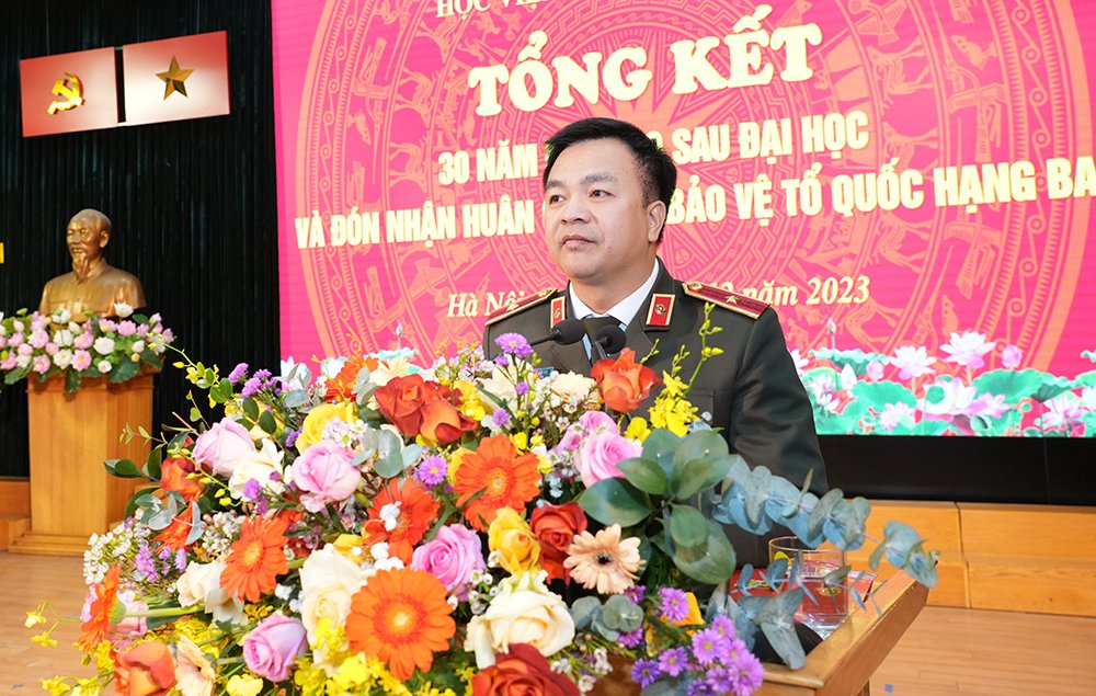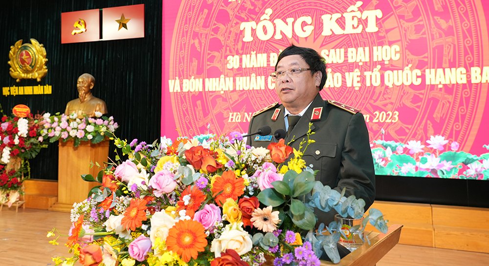Đồng chí Bộ trưởng khẳng định, Học viện ANND là sơ sở đào tạo trọng điểm của ngành Công an với bề dày truyền thống 77 năm xây dựng và trưởng thành, trong đó có 30 năm đào tạo sau đại học, đóng góp quan trọng vào sự nghiệp bảo vệ an ninh quốc gia, bảo đảm trật tự, an toàn xã hội và xây dựng lực lượng Công an nhân dân. Học viện đã đào tạo, bồi dưỡng hàng vạn cán bộ trình độ đại học, sau đại học có phẩm chất chính trị, trình độ học vấn, kiến thức chuyên môn nghiệp vụ, có năng lực giải quyết những vấn đề mà thực tiễn đặt ra. Nhiều cán bộ giữ cương vị trọng trách của Đảng, Nhà nước và ngành Công an; nhiều người trở thành anh hùng lực lượng vũ trang, Nhà giáo nhân dân, Nhà giáo ưu tú.
