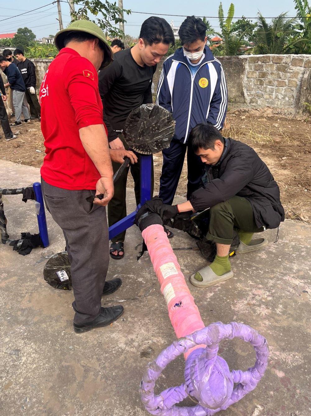 Các học viên tham gia lắp đặt công trình thể thao công cộng tại địa phương.