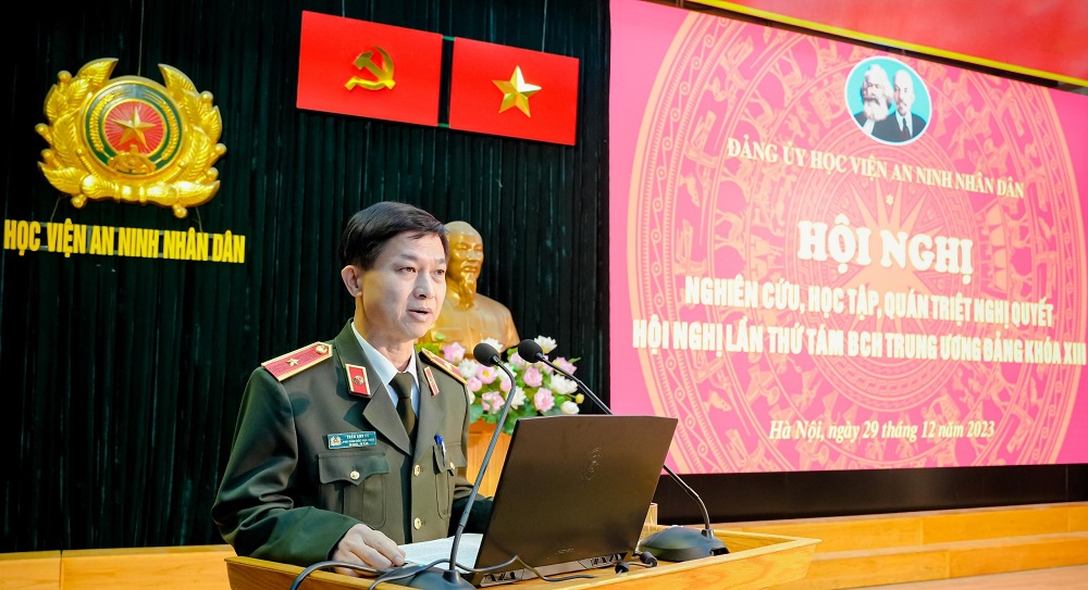 Thực hiện Kế hoạch số 208-KH/ĐU của Đảng ủy Công an Trung ương về việc tổ chức nghiên cứu, học tập, quán triệt và tuyên truyền Nghị quyết Hội nghị lần thứ tám Ban Chấp hành Trung ương Đảng khóa XIII, ngày 29/12/2023, Đảng ủy Học viện An ninh nhân dân tổ chức Hội nghị nghiên cứu, học tập, quán triệt Nghị quyết Trung ương tám khoá XIII trong Đảng bộ Học viện. Thiếu tướng, PGS.TS Trần Anh Vũ - Phó Bí thư Đảng ủy, Phó Giám đốc Học viện chủ trì Hội nghị.