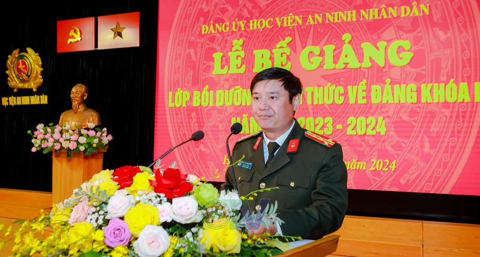Phát biểu tại Lễ Bế giảng, Đại tá, PGS.TS Chu Quang Thiện nhấn mạnh, lớp bồi dưỡng nhận thức về Đảng đã trang bị cho học viên những kiến thức cơ bản của chủ nghĩa Mác-Lênin, tư tưởng Hồ Chí Minh, Cương lĩnh xây dựng đất nước trong thời kỳ quá độ lên chủ nghĩa xã hội và đường lối cách mạng Việt Nam, chiến lược phát triển kinh tế - xã hội. Trên cơ sở đó, học viên sẽ xây dựng động cơ vào Đảng đúng đắn, nâng cao ý thức tu dưỡng, rèn luyện về mọi mặt; đề ra kế hoạch phấn đấu để trở thành đảng viên Đảng Cộng sản Việt Nam. Đồng chí chúc mừng học viên lớp bồi dưỡng đã hoàn thành xuất sắc nhiệm vụ học tập; biểu dương tinh thần học tập nghiêm túc; tích cực nghiên cứu, lĩnh hội kiến thức; chấp hành và thực hiện nghiêm nội quy, quy định của Đảng, của Bộ Công an và Học viện.