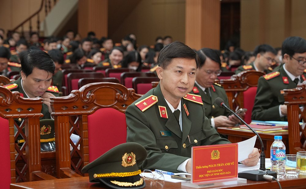 Thiếu tướng, PGS.TS Trần Anh Vũ - Phó Giám đốc Học viện điều hành phần tham luận tại Hội nghị.