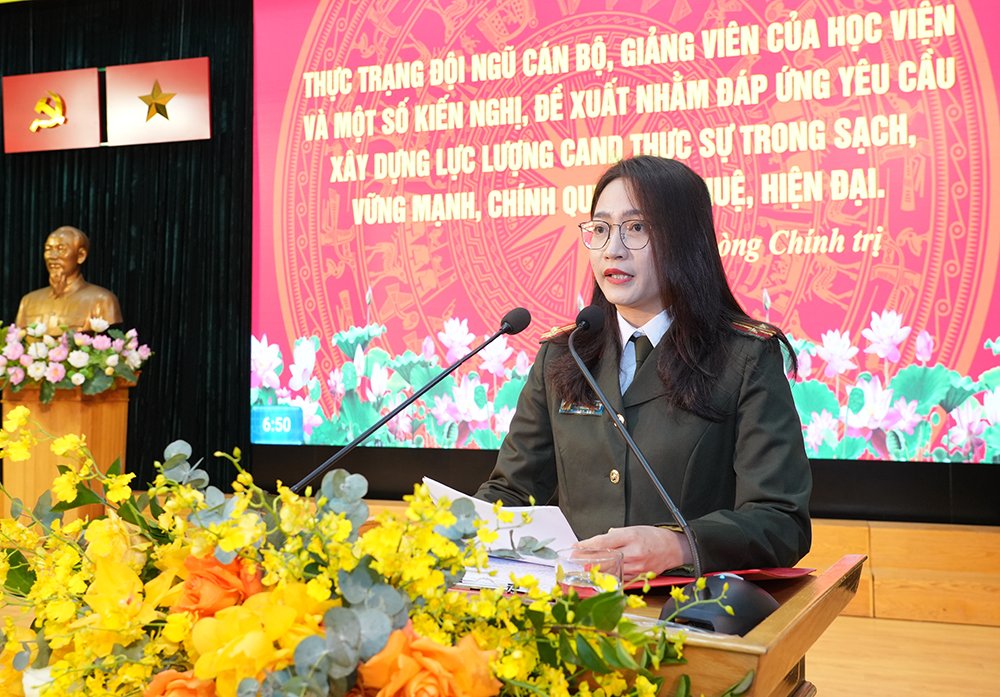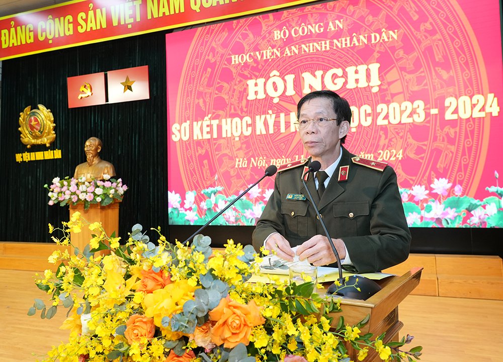 Báo cáo khẳng định, học kỳ I năm học 2023 - 2024 diễn ra trong bối cảnh Bộ Công an và Học viện ANND tiếp tục triển khai thực hiện Nghị quyết số 12-NQ/TW ngày 16/03/2022 của Bộ Chính trị về “Đẩy mạnh xây dựng lực lượng Công an nhân dân thật sự trong sạch, vững mạnh, chính quy, tinh nhuệ, hiện đại, đáp ứng yêu cầu, nhiệm vụ trong tình hình mới”; triển khai thực hiện Đề án số 19 ngày 10/07/2023 của Bộ Công an về “Tiếp tục kiện toàn tổ chức bộ máy bên trong của Công an các đơn vị, địa phương tinh, gọn, mạnh”. Trong học kỳ vừa qua, với sự quan tâm, chỉ đạo sát sao của Đảng uỷ, Ban Giám đốc Học viện cùng tinh thần trách nhiệm nỗ lực, quyết tâm phấn đấu của tập thể cán bộ, giảng viên, công nhân viên, học viên, Học viện đã triển khai thực hiện tốt các chỉ tiêu công tác, hoàn thành xuất sắc các nhiệm vụ đề ra, tạo sự chuyển biến tích cực trên tất cả các mặt công tác, được lãnh đạo Bộ Công an ghi nhận, đánh giá cao.