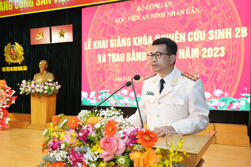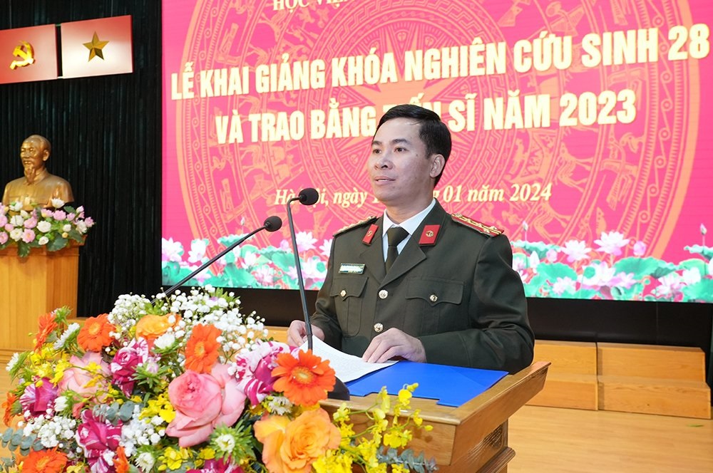 Trong diễn văn khai giảng, Đại tá, GS.TS Nguyễn Trường Thọ - Phó Giám đốc Học viện khẳng định, đào tạo tiến sĩ là đào tạo nguồn nhân lực có trình độ cao nhất trong hệ thống giáo dục quốc gia. Mục tiêu đào tạo trình độ tiến sĩ là nhằm đào tạo cán bộ Công an có bản lĩnh chính trị vững vàng, có phẩm chất đạo đức tốt; có kiến thức toàn diện, tiên tiến, chuyên sâu về khoa học an ninh; có năng lực tư duy lý luận, khả năng nghiên cứu độc lập, sáng tạo, phát hiện và giải quyết được những vấn đề mới về lý luận, thực tiễn trong công tác; khả năng tổ chức và hướng dẫn nghiên cứu khoa học; năng lực tổ chức, chỉ đạo hoạt động thực tiễn, đáp ứng yêu cầu nhiệm vụ bảo vệ an ninh quốc gia, đảm bảo trật tự, an toàn xã hội và xây dựng lực lượng Công an nhân dân.