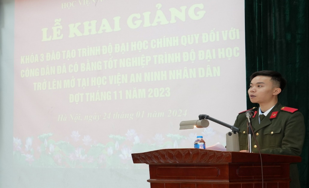 Trong diễn văn Khai giảng, thay mặt Đảng ủy, Ban Giám đốc Học viện, Đại tá, TS Nguyễn Văn Thiết - Phó Giám đốc Học viện nhấn mạnh, đây là Khoá thứ 3 Học viện đào tạo học viên Văn bằng 2 tuyển mới theo Đề án mở rộng thí điểm tuyển sinh đào tạo trình độ đại học đối với người đã có bằng tốt nghiệp trình độ đại học trở lên trong CAND. Đợt tuyển sinh bổ sung tháng 11 năm 2023 có tổng số 102 thí sinh trúng tuyển, trong đó có 42 thí sinh đã trúng tuyển theo phương thức xét tuyển thẳng và 60 thí sinh đã trúng tuyển theo phương thức thi tuyển. Trong quá trình học tập, học viên được trang bị những kiến thức cơ sở, kiến thức chuyên ngành về nghiệp vụ an ninh. Đây là tri thức quan trọng, cần thiết ở bậc đại học đối với người cán bộ An ninh. Ngoài ra, học viên cũng sẽ được trang bị các kỹ năng nghề nghiệp, kỹ năng mềm và làm quen với phương pháp nghiên cứu khoa học, tham gia các cuộc thi nghiên cứu khoa học của Bộ Giáo dục & Đào tạo, Bộ Công an và Học viện tổ chức.