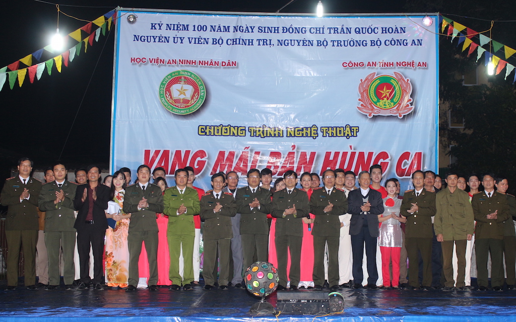 Tối 26-12, tại nhà văn hoá xã Nam Trung, huyện Nam Đàn, Nghệ An, Đoàn thanh niên Học viện ANND phối hợp với Đoàn thanh niên Công an tỉnh Nghệ An và Huyện Đoàn Nam Đàn tổ chức chương trình nghệ thuật kỷ niệm 100 năm ngày sinh đồng chí Trần Quốc Hoàn (1916-2016), nguyên Ủy viên Bộ Chính trị, nguyên Bộ trưởng Bộ Công an.