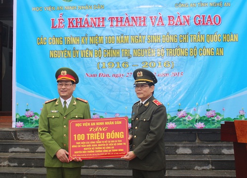 Trong chuỗi hoạt động về nguồn tại quê hương Bộ trưởng Trần Quốc Hoàn, sáng 27-12, Học viện ANND tổ chức khánh thành, bàn giao công trình dát vàng tượng và xây dựng Bia khắc ghi tiểu sử, thân thế sự nghiệp của đồng chí Bộ trưởng trong khuôn viên khu tưởng niệm Bộ trưởng Trần Quốc Hoàn, xã Nam Trung, huyện Nam Đàn, Nghệ An.