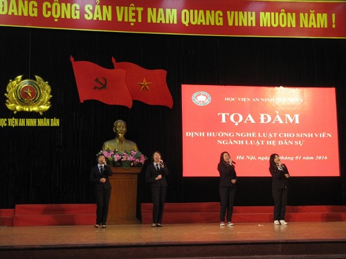 Ngày 26/01/2016, được sự đồng ý của Ban Giám đốc Học viện An ninh nhân dân, Khoa Luật tổ chức Tọa đàm định hướng nghề luật cho sinh viên chuyên ngành Luật hệ dân sự. Tới dự buổi tọa đàm có đồng chí Thiếu tướng, GS, TS. Nguyễn Quý Khoát – Phó Giám đốc Học viện và bốn đại biểu khách mời: Luật sư Nguyễn Văn Chiến (Phó Chủ tịch Liên đoàn Luật sư Việt Nam), TS Vũ Thị Hòa (Phó Trưởng Khoa Đào đạo Luật sư - Học viện Tư pháp), TS Nguyễn Thu Hiền (Thẩm phán, Phó Chánh án TAND quận Hoàn Kiếm), Luật sư Vũ Gia Trưởng (Văn phòng Luật sư Hồng Hải). Tham dự buổi tọa đàm còn có lãnh đạo, giáo viên Khoa Luật, đại diện các Khoa, Phòng chuyên môn trong Học viện cùng hơn 700 sinh viên Chuyên ngành Luật hệ dân sự khóa 1, 2, 3.