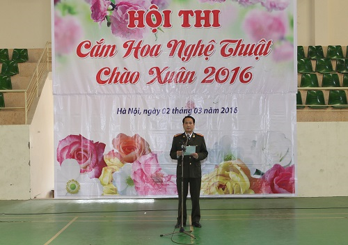 Đồng chí Thượng tá Nguyễn Hữu Anh phát biểu khai mạc tại Hội thi cắm hoa nghệ thuật chào Xuân 2016.