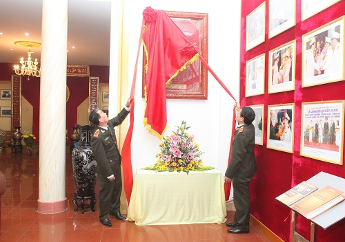 Đồng chí Trung tướng Trần Bá Thiều, Tổng cục trưởng Tổng cục Chính trị CAND trao tặng Bức chữ di huấn của Chủ tịch Hồ Chí Minh tại Phòng truyền thống Học viện ANND và chụp ảnh lưu niệm cùng Ban Giám đốc Học viện ANND