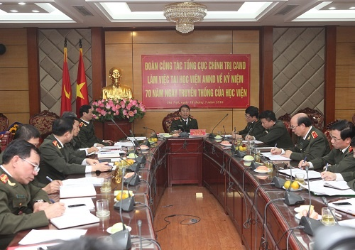 Sau khi nghe báo cáo và ý kiến trao đổi của các đồng chí trong Đảng uỷ, Ban Giám đốc Học viện ANND và lãnh đạo các Vụ, Cục của Tổng cục Chính trị CAND, đồng chí Tổng cục trưởng đã đánh giá cao sự năng động, sáng tạo của lãnh đạo Học viện ANND trong tổ chức thực hiện nhiệm vụ giáo dục đào tạo, nghiên cứu khoa học, xây dựng và phát triển Học viện trong thời gian qua. Đồng chí yêu cầu trong thời gian tới để tổ chức tốt lễ kỷ niệm 70 năm Ngày truyền thống, Học viện cần chuẩn bị các chương trình, kế hoạch cho hiệu quả, thiết thực và tiết kiệm, bên cạnh đó cần phối hợp với các đơn vị chức năng của Tổng cục nghiên cứu xây dựng hoàn thiện chức năng, bộ máy tổ chức của Học viện phù hợp với yêu cầu nhiệm vụ trong tình hình mới. Đồng chí mong muốn trong thời gian tới, phát huy những thành tích đã đạt được, khắc phục các khó khăn, Học viện ANND tiếp tục phấn đấu hoàn thành tốt nhiệm vụ giáo dục đào tạo mà Đảng uỷ Công an Trung ương và lãnh đạo Bộ đã giao cho.