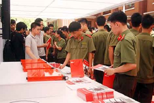 Sinh viên Học viện ANND tham quan các gian hàng về giải pháp an ninh mạng của BKAV và nghe tư vấn nghề nghiệp
