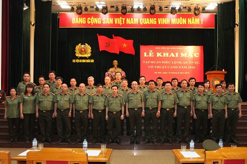 Thành phần tham gia tập huấn là toàn thể cán bộ, giáo viên, công nhân viên Học viện ANND; được tổ chức làm 2 đợt bắt đầu từ ngày 10/8/2016 đến ngày 30/8/2016. Nội dung tập huấn gồm: giới thiệu một số nội dung Thông tư số 37 của BCA về sửa đổi, bổ sung một số điều trong Thông tư 17, 18, 19 của Bộ Công an, hạ khoa mục và thực hành một số động tác cơ bản được quy định trong điều lệnh CAND các Nghi lễ. Lễ đón nhận Huân, Huy chương; lễ phong cấp, bậc hàm; lễ chào cờ Tổ quốc trong nhà và ngoài trời. Hạ khoa mục và thực hành các thế đứng và các bài võ thể dục CAND; thực hành thao tác sử dụng súng quân dụng các loại tập và thi bắn đạn thật...