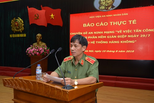 Dưới sự chỉ đạo của đồng chí Thiếu tướng Nguyễn Hồng Hải – Phó giám đốc Học viện An ninh nhân dân, buổi báo cáo thực tế đã diễn ra sôi nổi, thu hút đông đủ cán bộ giáo viên, sinh viên trong toàn Học viện. Buối báo cáo với sự trình bày của ông Vũ Ngọc Sơn – Phó chủ tịch BKAV, phụ trách mảng phân tích mã độc, Chia sẻ thông tin về cuộc tấn công sử dụng phần mềm gián điệp ngày 29/7 vào hệ thống hàng không; Ông Ngô Tuấn Anh – Phó chủ tịch BKAV, phụ trách mảng an ninh mạng, trình bày về nguy cơ an ninh mạng, cách phòng chống. Ngoài những chủ đề trên thì ông Ngô Tuấn Anh cũng chia sẻ thêm thông tin về tình hình An ninh mạng trong thời gian qua.