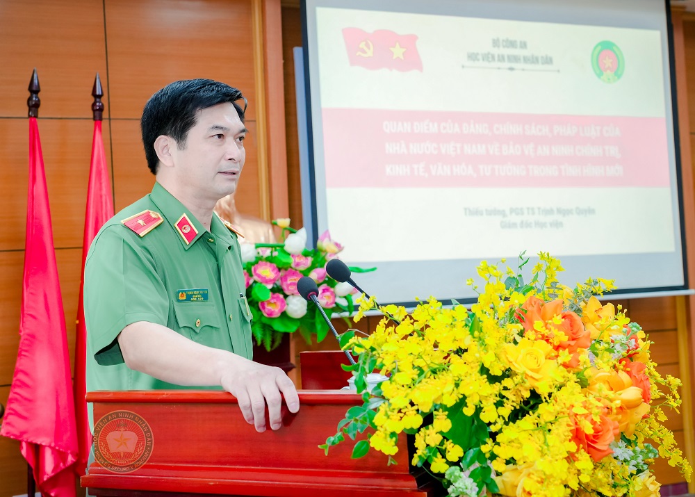 Trong bài giảng, Thiếu tướng, PGS.TS Trịnh Ngọc Quyên - Giám đốc Học viện ANND đã truyền đạt tới học viên lớp bồi dưỡng các vấn đề: nhận thức về bảo vệ an ninh chính trị, an ninh kinh tế, an ninh văn hóa, tư tưởng; tình hình an ninh chính trị, kinh tế, văn hóa, tư tưởng hiện nay; quan điểm của Đảng; chính sách, pháp luật của Nhà nước bảo vệ an ninh chính trị, kinh tế, văn hóa, tư tưởng; các nhiệm vụ bảo vệ an ninh chính trị, kinh tế, văn hóa, tư tưởng trong giai đoạn hiện nay và vai trò, trách nhiệm của người đứng đầu Công an các đơn vị, địa phương trong tổ chức bảo vệ an ninh chính trị, kinh tế, văn hóa, tư tưởng.