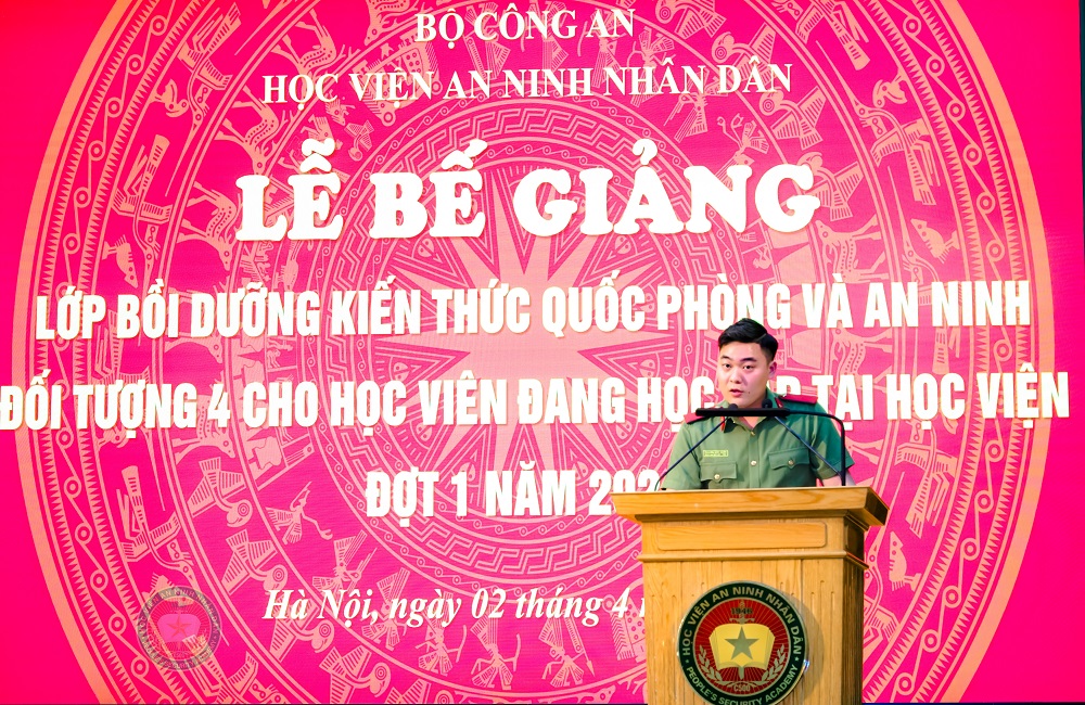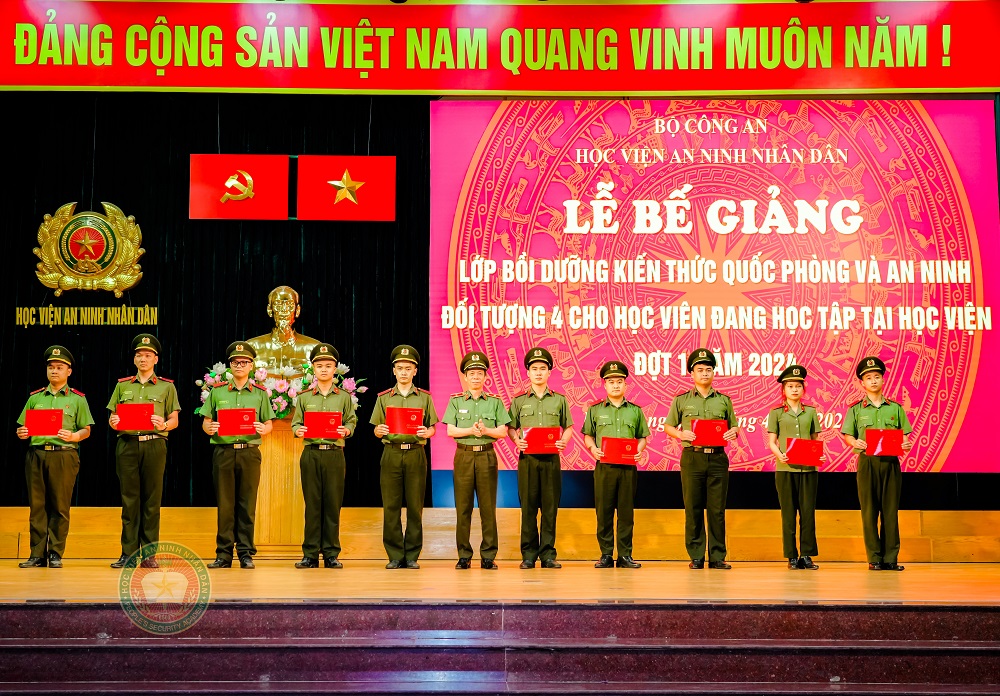 Chiều ngày 02/4/2024, Học viện An ninh nhân dân (ANND) tổ chức Lễ Bế giảng lớp bồi dưỡng kiến thức quốc phòng và an ninh đối tượng 4 cho học viên đang học tập tại Học viện đợt 1 năm 2024.