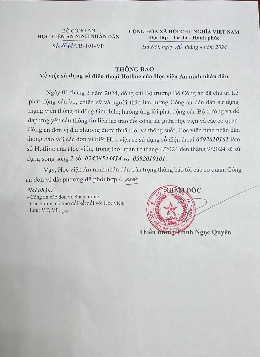 Trong thời gian từ tháng 4/2024 đến tháng 9/2024, Học viện An ninh nhân dân sẽ sử dụng song song 2 số hotline:
