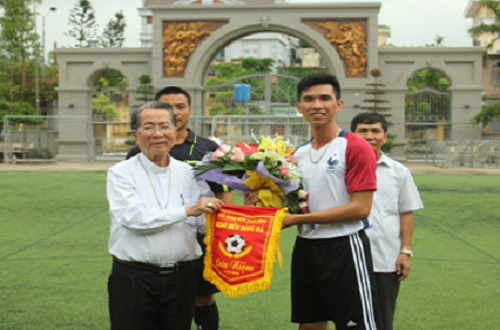 Giám mục Nguyễn Văn Đệ - Giám mục giáo phận Thái Bình trao lưu niệm cho đại diện đoàn bóng đá lớp D44E, Học viện An ninh nhân dân.