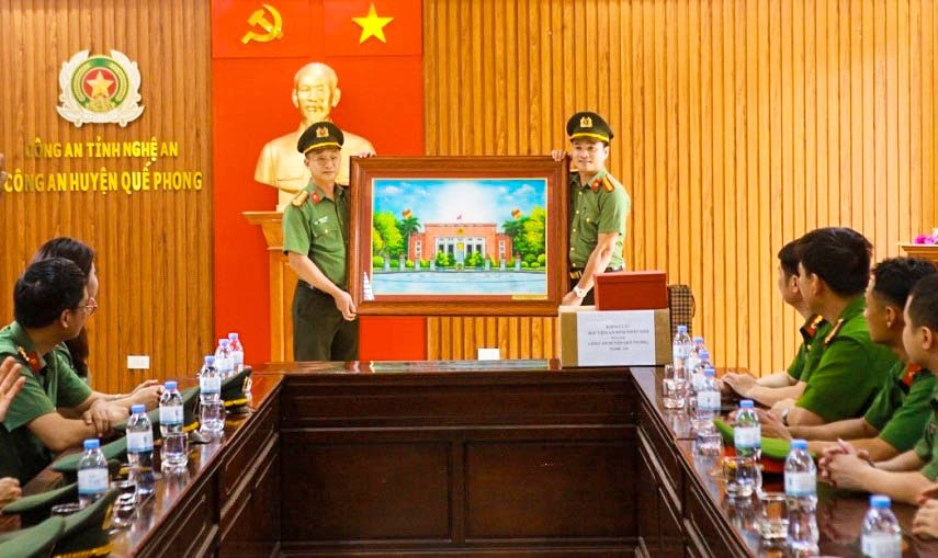 Đoàn công tác tặng quà lưu niệm cho Công an huyện Quế Phong và Ủy ban nhân dân xã Hạnh Dịch.