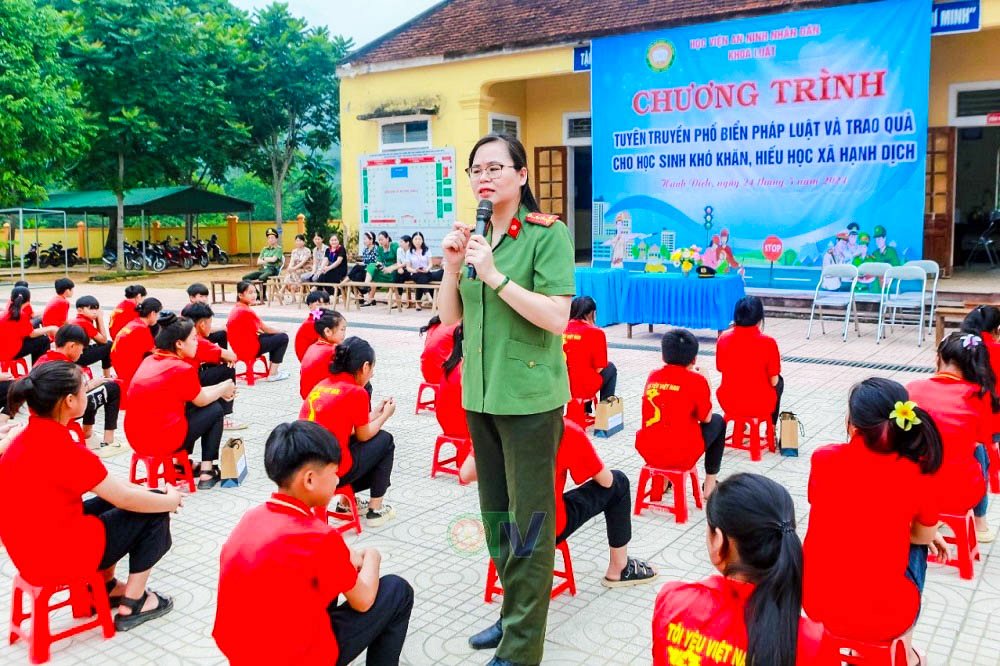 Giảng viên Khoa Luật Học viện An ninh nhân dân tuyên truyền, phổ biến, giáo dục pháp luật cho học sinh Trường phổ thông dân tộc bán trú Tiểu học và Trung học cơ sở Hạnh Dịch.