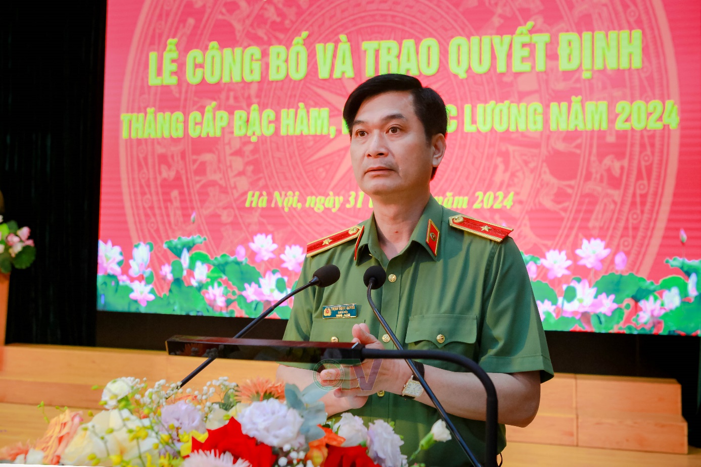 Phát biểu tại buổi Lễ, Thiếu tướng, PGS.TS Trịnh Ngọc Quyên - Bí thư Đảng ủy, Giám đốc Học viện chúc mừng các đồng chí đã được Đảng, Nhà nước, Bộ Công an thăng cấp bậc hàm, nâng bậc lương năm 2024. Thiếu tướng, PGS.TS Trịnh Ngọc Quyên khẳng định: Đây không chỉ là niềm vui, niềm vinh dự của cá nhân các đồng chí cán bộ, giảng viên mà còn là niềm vui chung của Học viện, đồng thời thể hiện sự quan tâm, ghi nhận, đánh giá cao của Đảng, Nhà nước, Bộ Công an và của Học viện đối với quá trình công tác, phấn đấu và trưởng thành của các đồng chí, cũng như những đóng góp vào sự nghiệp giáo dục, đào tạo trong Công an nhân dân nói riêng và sự nghiệp bảo vệ an ninh quốc gia, bảo đảm trật tự an toàn xã hội chung.