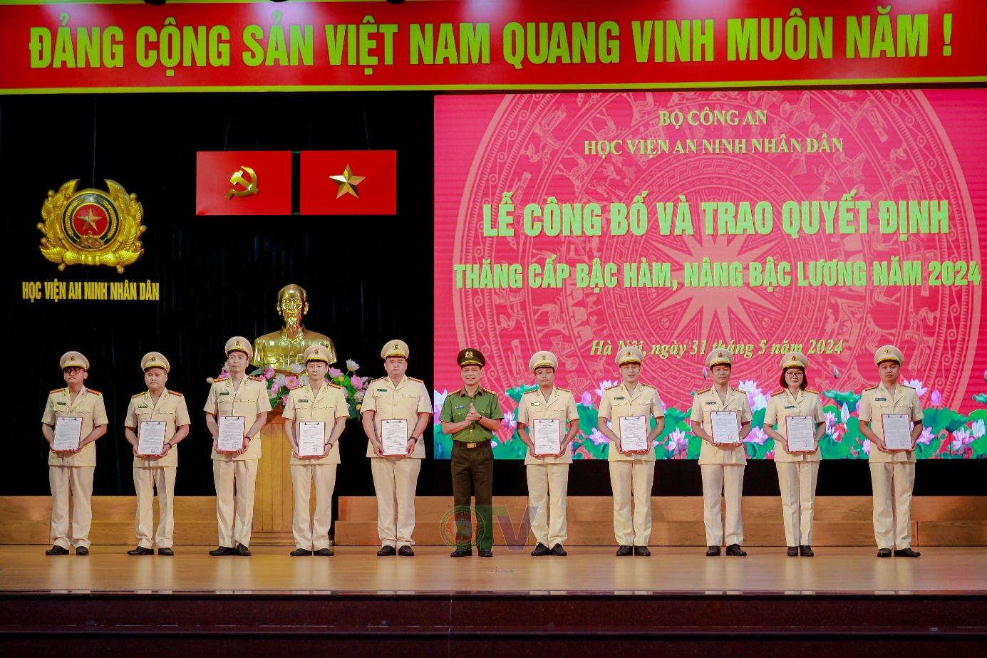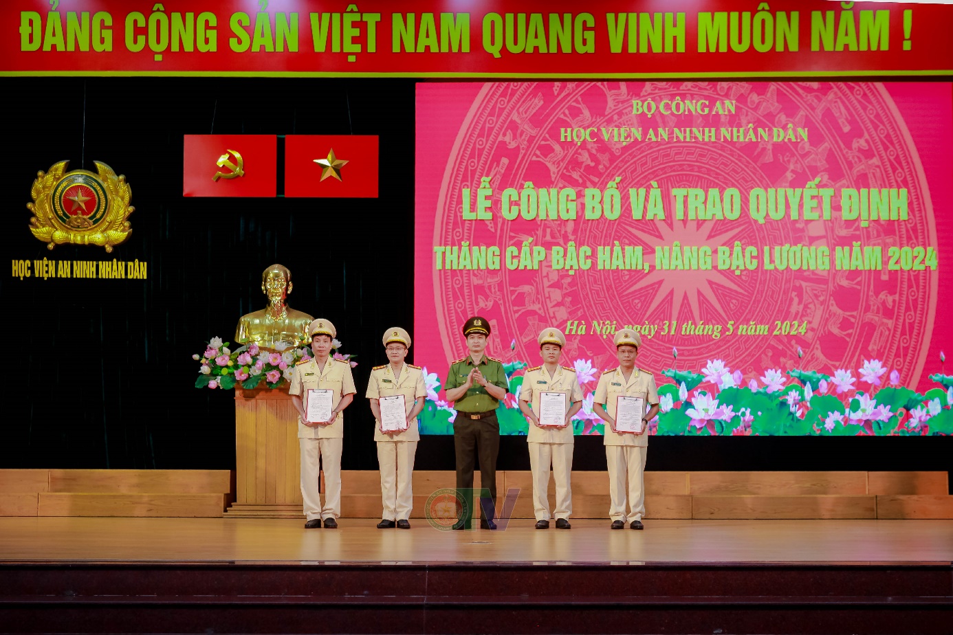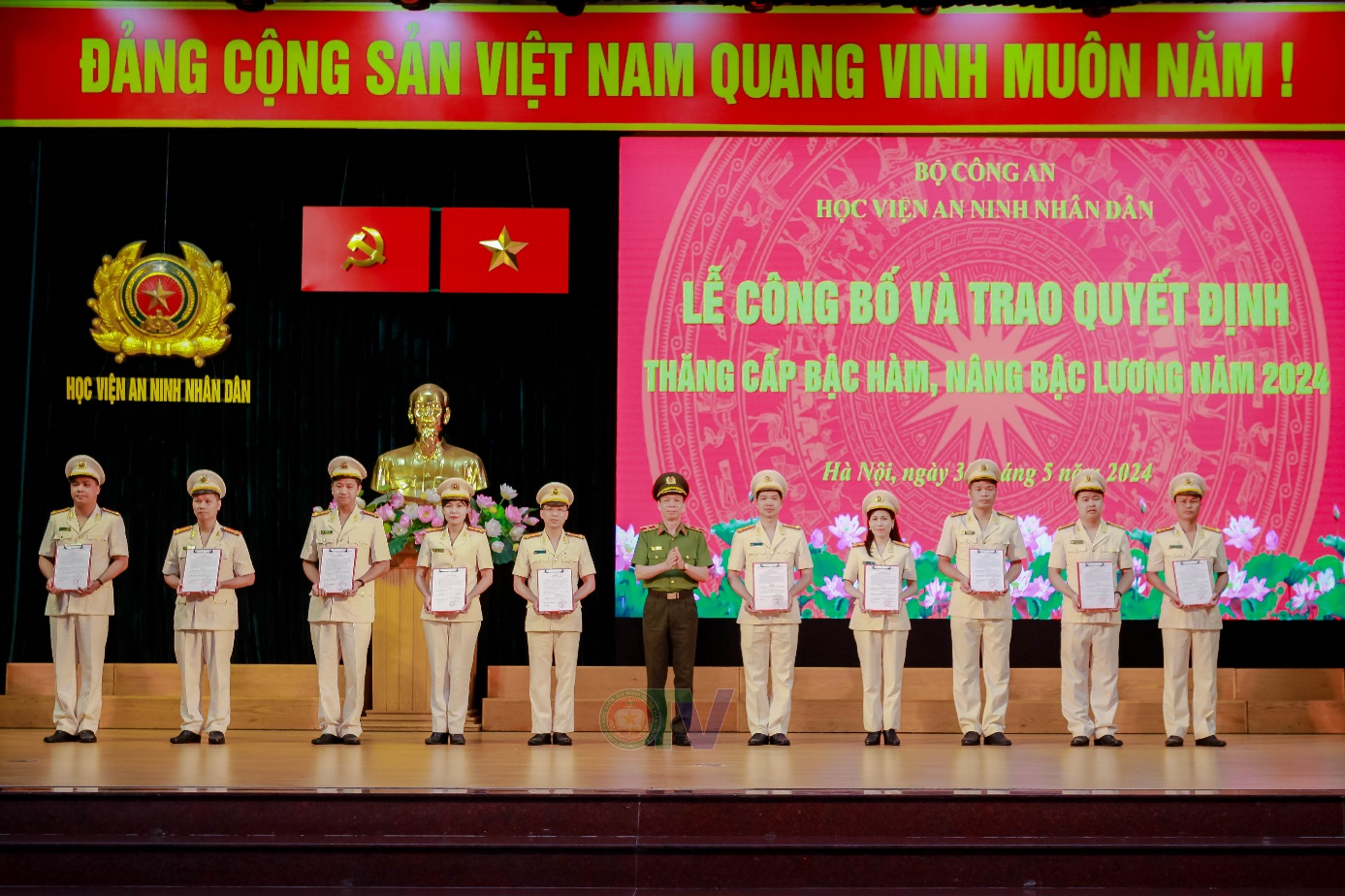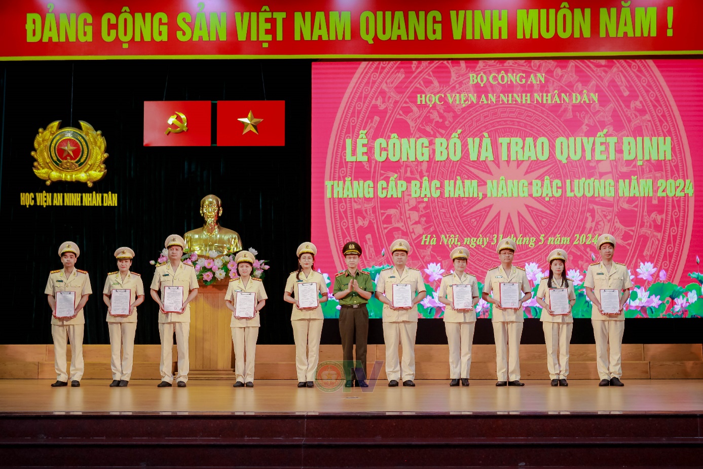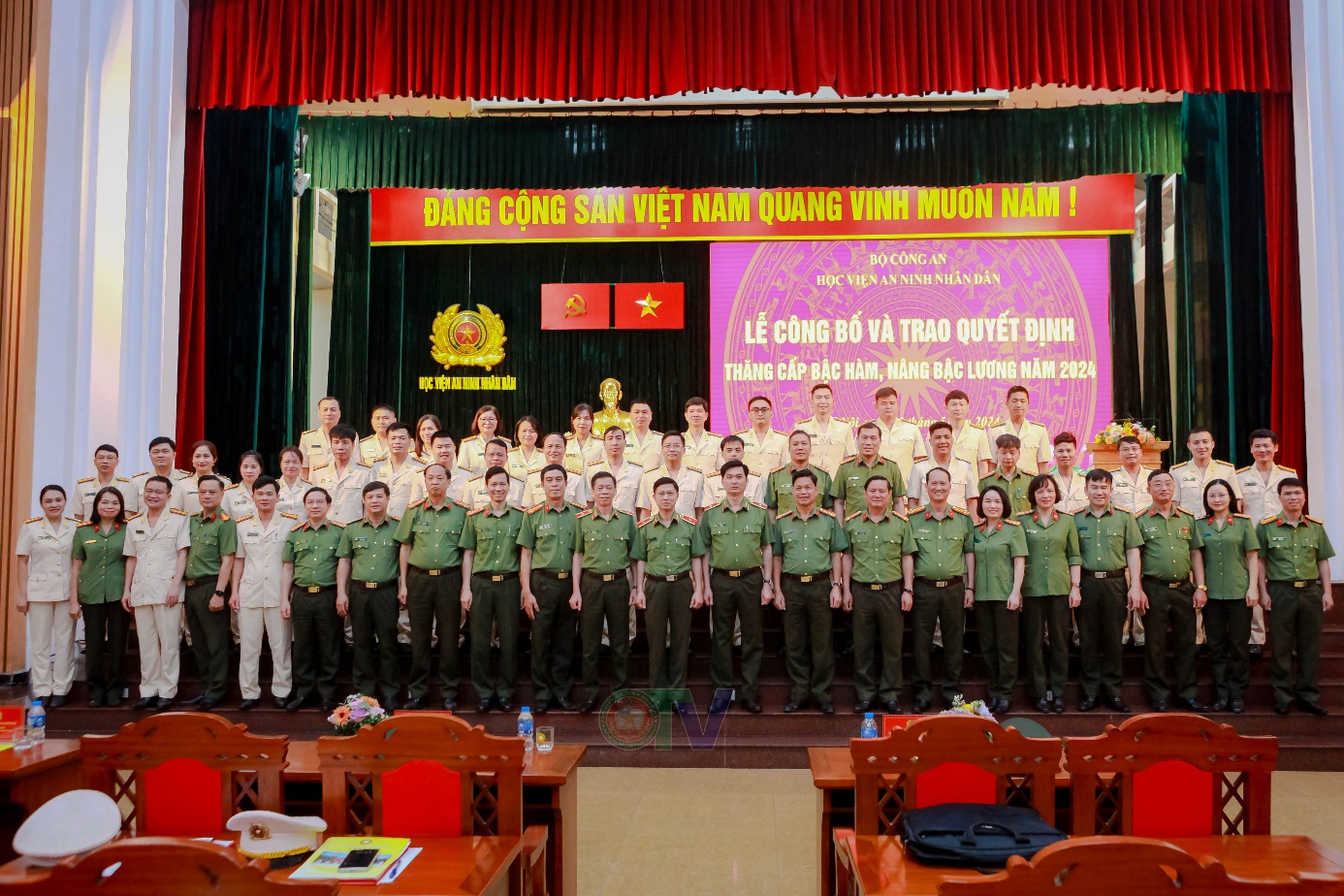 Năm 2024, Học viện ANND có 195 cán bộ, giảng viên được thăng cấp bậc hàm và nâng bậc lương. Đây là những đồng chí cán bộ ưu tú được Bộ Công an, Đảng ủy, Ban Giám đốc Học viện tín nhiệm, giao những nhiệm vụ quan trọng trong sự nghiệp giáo dục, đào tạo. Trong niên hạn, các đồng chí đã tận tâm, tận tụy, nỗ lực để hoàn thành xuất sắc các nhiệm vụ được Đảng ủy, Ban Giám đốc giao, đóng góp xứng đáng vào thành tích chung của Học viện. Qua đó, góp phần xây dựng Học viện trở thành trung tâm đào tạo, nghiên cứu khoa học hàng đầu của lực lượng Công an nhân dân.