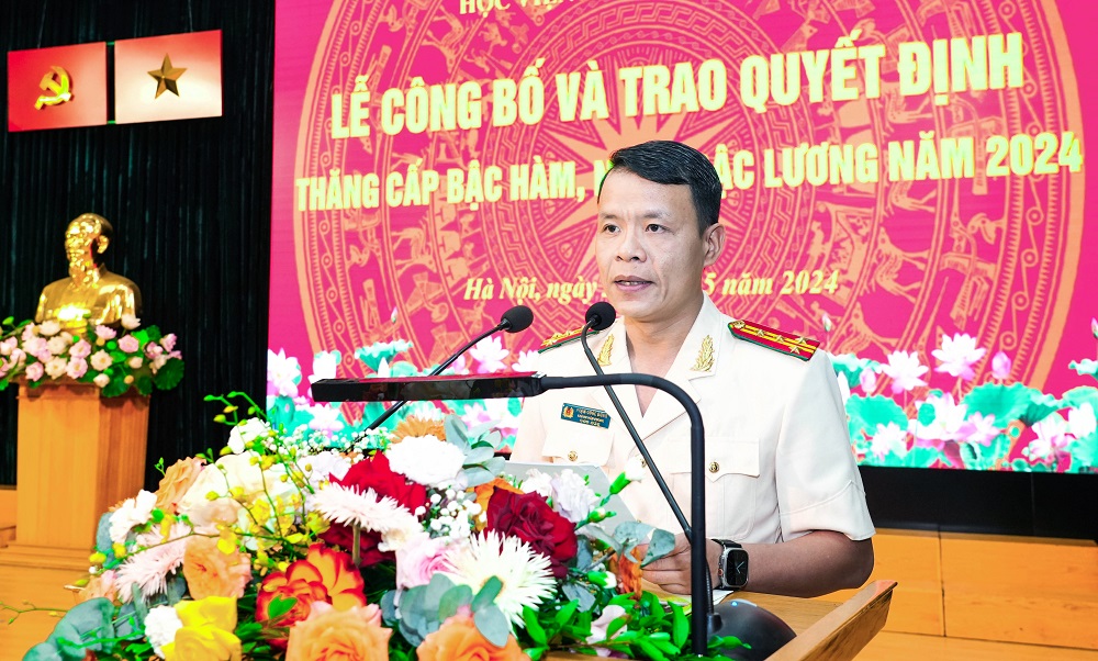 Tại buổi Lễ, thay mặt cho cán bộ, giảng viên được thăng cấp bậc hàm, nâng bậc lương năm 2024, Đại tá, PGS.TS Phạm Quốc Dũng - Chánh Văn phòng Học viện bày tỏ niềm vinh dự, lòng biết ơn sâu sắc đến Đảng, Nhà nước, lãnh đạo Bộ Công an và Đảng ủy, Ban Giám đốc Học viện ANND đã quan tâm, tạo mọi điều kiện để thực hiện đầy đủ, kịp thời các chính sách về thăng cấp bậc hàm, nâng bậc lương theo quy định. Đồng chí cũng chia sẻ, tất cả các đồng chí được thăng cấp bậc hàm, nâng bậc lương năm 2024 đều nhận thức rõ niềm vinh dự, tự hào luôn đi cùng với ý thức và trách nhiệm. Người cán bộ Công an nhân dân nói chung, cán bộ, giáo viên Học viện ANND nói riêng, cần phải có bản lĩnh chính trị vững vàng, phẩm chất đạo đức trong sáng, trách nhiệm cao, năng lực tốt để có thể hoàn thành xuất sắc mọi nhiệm vụ được giao.