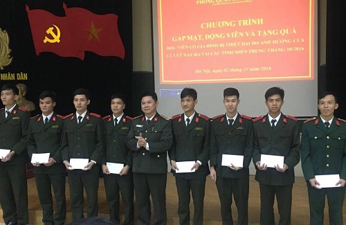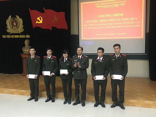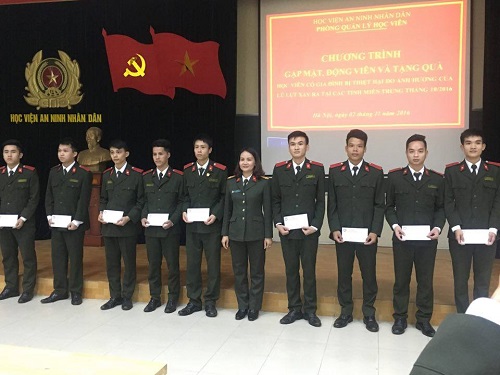 Nhằm động viên, hỗ trợ các học viên có gia đình bị thiệt hại do ảnh hưởng của lũ lụt, góp phần đề cao tinh thần tương thân tương ái, nghĩa tình vì đồng đội thân yêu, chiều ngày 02/11/2016, Học viện ANND đã tổ chức buổi gặp mặt và tặng quà học viên có gia đình bị thiệt hại do ảnh hưởng của lũ lụt xảy ra tại các tỉnh miền Trung tháng 10/2016.