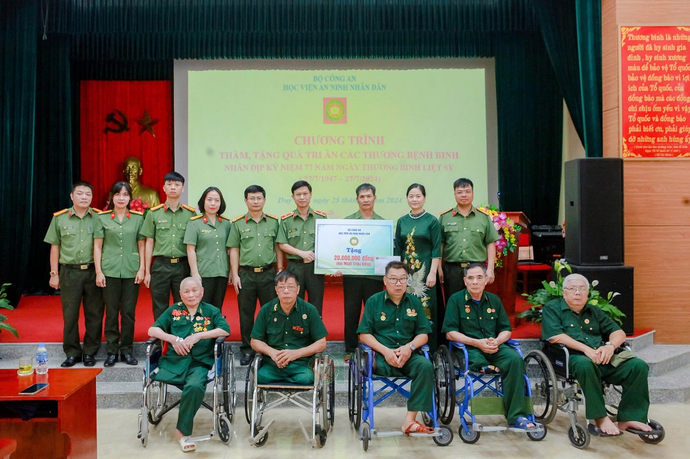 Tại Trung tâm điều dưỡng thương binh huyện Duy Tiên, tỉnh Hà Nam, Đoàn công tác Học viện do Thiếu tướng, PGS.TS Trần Anh Vũ, Phó Giám đốc Học viện làm Trưởng đoàn cùng đại diện lãnh đạo các đơn vị chức năng thuộc Học viện đã thăm hỏi, trao tặng phần quà 20 triệu đồng cho các thương binh, bệnh binh đang điều dưỡng tại Trung tâm.
