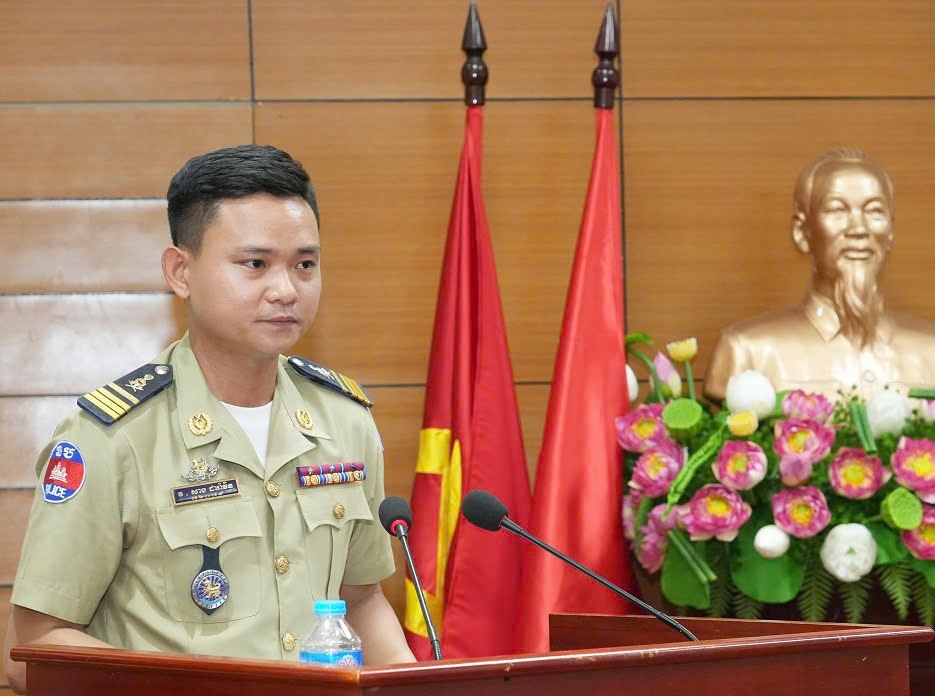 Phát biểu cảm tưởng tại buổi Lễ, Thiếu tá Sang Da Ra Ven, Trưởng đoàn cán bộ Bộ Nội vụ Vương quốc Capuchia - đại diện cho học viên lớp bồi dưỡng trân trọng cảm ơn lãnh đạo Bộ Công an Việt Nam, Bộ Nội vụ Vương quốc Campuchia, Đảng uỷ, Ban Giám đốc Học viện đã quan tâm, giúp đỡ để học viên có điều kiện được học tập, trau dồi kiến thức chuyên môn nghiệp vụ; tham quan, trao đổi, học hỏi kinh nghiệm với Công an các đơn vị, địa phương Việt Nam; đồng thời, xin hứa sẽ nêu cao tinh thần trách nhiệm, chấp hành nghiêm quy chế học tập và rèn luyện của Học viện, khắc phục khó khăn, hoàn thành xuất sắc nhiệm vụ học tập.
