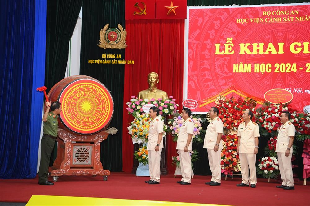 Bộ trưởng Lương Tam Quang đánh trống khai giảng năm học mới tại Học viện CSND. |