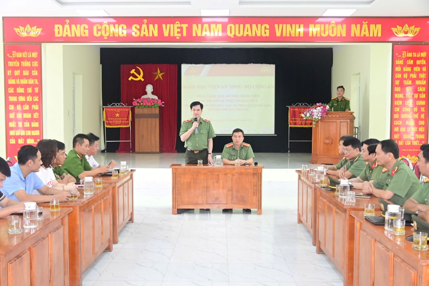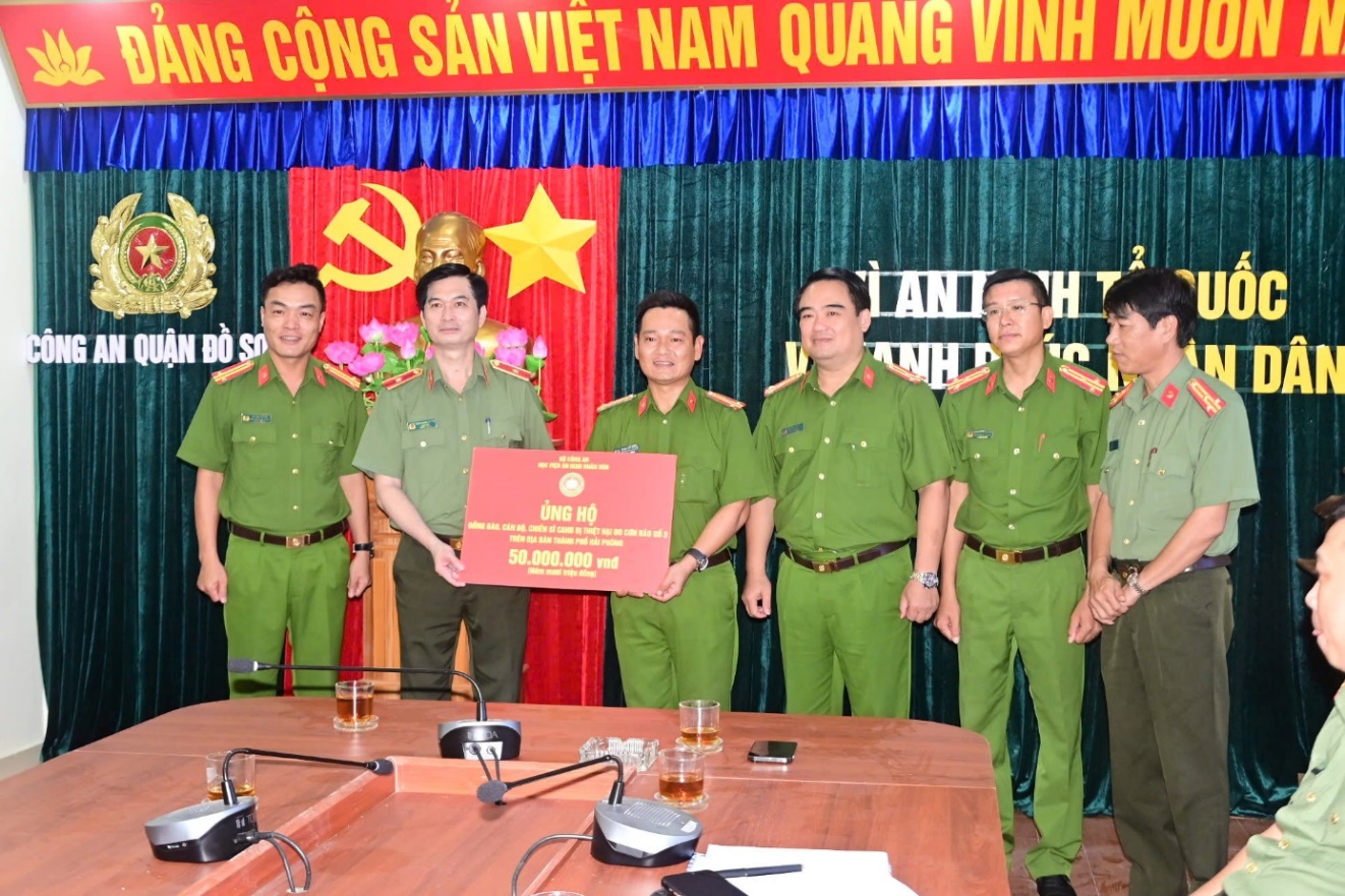 Sau báo cáo của địa phương, thay mặt đoàn công tác, PGS.TS, Thiếu tướng Trịnh Ngọc Quyên - Bí thư Đảng ủy, Giám đốc Học viện đã gửi lời thăm hỏi, động viên, chia sẻ với những khó khăn, vất vả mà đồng bào, cán bộ chiến sĩ CAND cũng như chính quyền, đoàn thể đang phải khắc phục, vượt qua trong thời điểm này. Đồng thời, Đoàn công tác của Học viện cũng gửi tặng nhân dân trên địa bàn phường Vạn Hương số tiền 100 triệu đồng; ủng hộ cán bộ, chiến sĩ Công an quận Đồ Sơn 50 triệu đồng để chung tay hỗ trợ khôi phục đời sống, hoạt động sản xuất cũng như trụ sở làm việc của nhân dân, chính quyền địa phương.