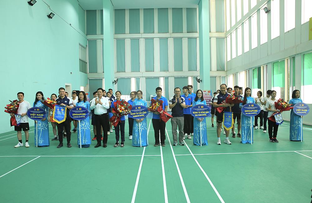 Thứ trưởng Lê Quốc Hùng tặng hoa cho các vận động viên. |