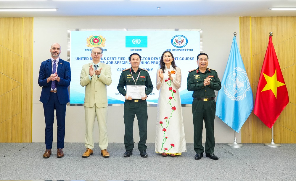Để công nhận sự nỗ lực học tập nghiêm túc, hiệu quả của các học viên trong thời gian học tập vừa qua, Ban tổ chức gồm đại diện là bà Pauline Tamesis - Điều phối viên Liên hợp quốc tại Việt Nam, Thiếu tướng Nguyễn Sỹ Quang - Chánh VPTT về GGHB LHQ Bộ Công an, ông Ryan MC Kean, Giám đốc INL tại Việt Nam, và ông Denis Tikhomirov, chủ nhiệm Khóa tập huấn đã đại diện trao chứng chỉ cho học viên của khóa học.
