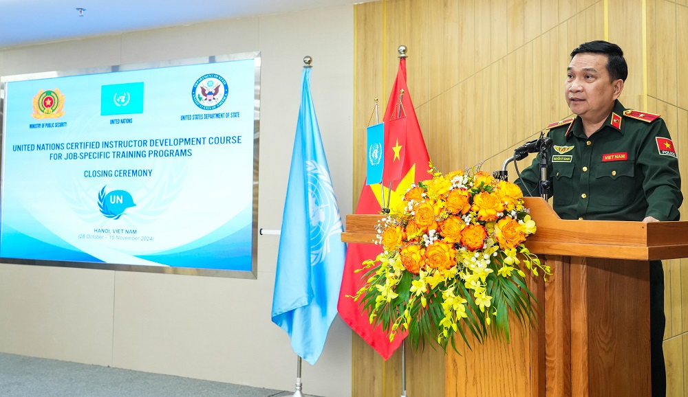 Phát biểu tại Lễ bế giảng, Bà Madame Pauline Tamesis - Điều phối viên Liên hợp quốc tại Việt Nam bày tỏ niềm vinh dự được tham dự Lễ bế giảng đồng thời, nhắc lại mối quan hệ truyền thống tốt đẹp giữa Việt Nam và Liên hợp quốc nói chung, với các Cơ quan của Liên hợp quốc nói riêng. Bà nhấn mạnh, việc Bộ Công an Việt Nam cử lực lượng tham gia hoạt động GGHB LHQ đã góp phần đáng kể vào nỗ lực của Việt Nam trong công cuộc tham gia thực hiện sứ mệnh xây dựng hòa bình của Liên hợp quốc. Đặc biệt, trong số các sĩ quan của Bộ Công an cử đi tham gia lực lượng GGHB LHQ có đến 32,5% là nữ cao hơn mục tiêu của Liên hợp quốc đề ra. Khi tham gia các phái bộ gìn giữ hòa bình của Liên hợp quốc, các sĩ quan cảnh sát Việt Nam đã thể hiện tốt phẩm chất, năng lực, trình độ chuyên môn của mình và nhanh chóng thích nghi với các điều kiện phức tạp, môi trường hoạt động đầy thách thức của các Phái bộ Liên hợp quốc. Ngoài ra còn quảng bá hình ảnh tươi đẹp về đất nước và con người Việt Nam thân thiện, mến khách, yêu chuộng hòa bình tới Liên hợp quốc và bạn bè quốc tế. Việc tổ chức thành công Khóa tập huấn này đã góp phần khẳng định thêm nỗ lực, quyết tâm của Bộ Công an Việt Nam trong việc tham gia hoạt động GGHB của LHQ.